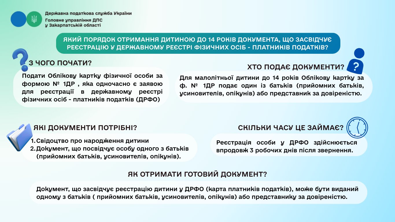 Який порядок отримання дитиною до 14 років документа, що засвідчує реєстрацію в Державному реєстрі фізичних осіб - платників податків?
