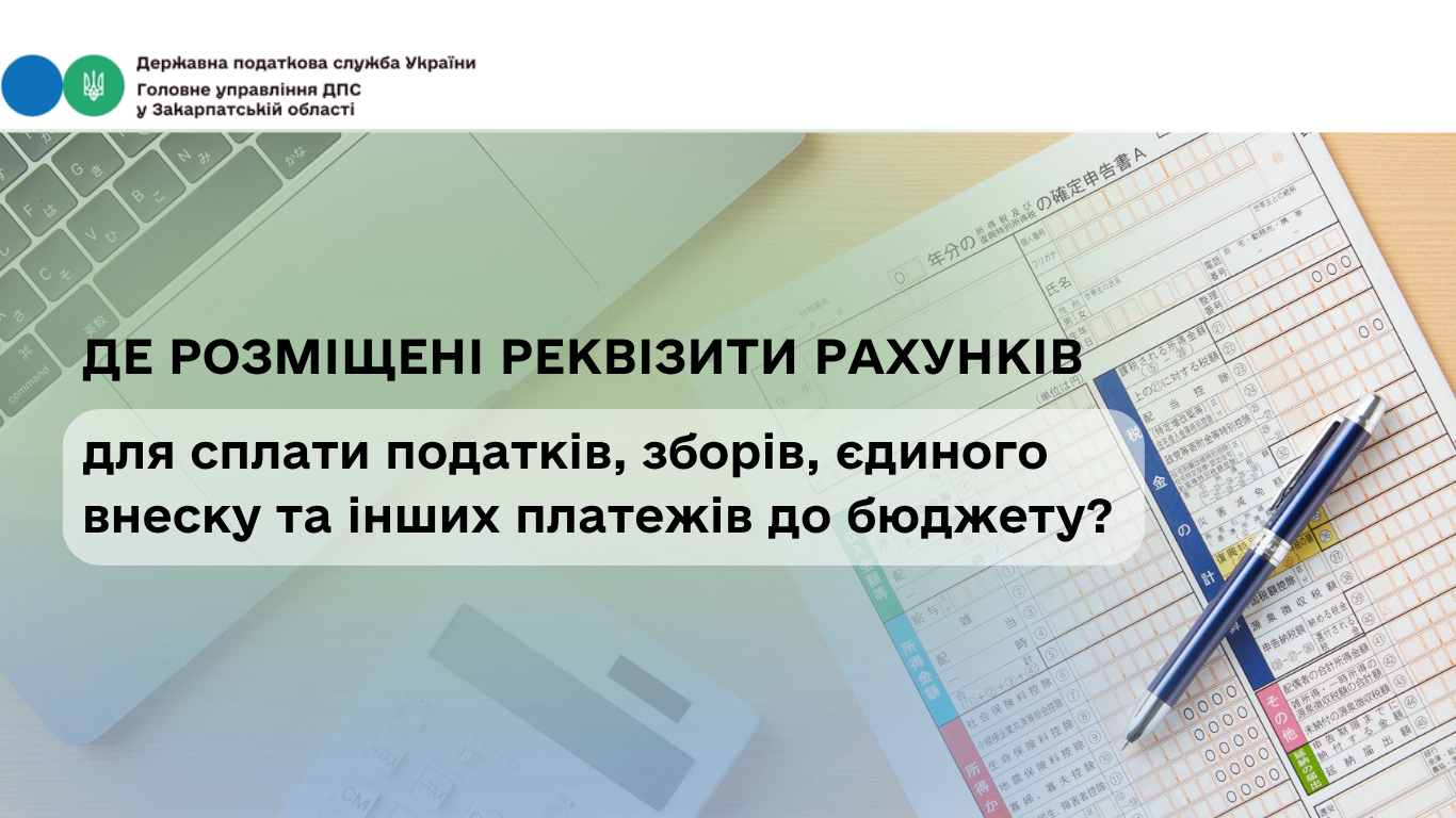 Головне управління ДПС у Закарпатській області  повідомляє , що  актуальні  реквізити  рахунків для сплати податків, зборів та платежів, відкритих Державною казначейською службою України розміщені на офіційному вебпорталі ГУ ДПС у Закарпатській області або на вебпорталі ДПС за  посиланням: Головна/Рахунки для сплати платежів (https://tax.gov.ua/rahunki-dlya-splati-platejiv).