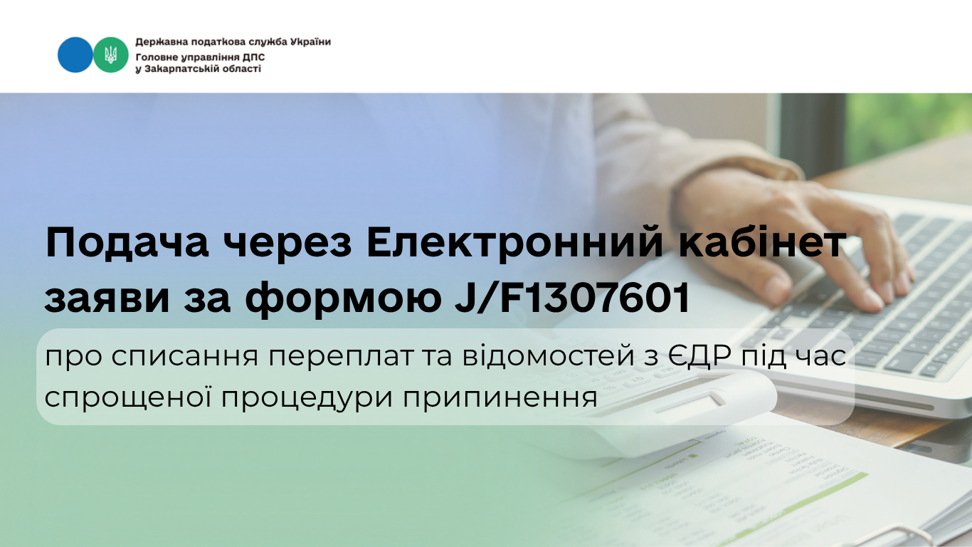 Фахівці ДПС у Закарпатській області інформують, в яких випадках та яким чином через Електронний кабінет надсилається заява про списання помилково та/або надміру сплачених грошових зобов’язань до бюджетів та єдиного внеску до фондів загальнообов’язкового державного соціального та пенсійного страхування та/або відомостей з ЄДР щодо платників, за якими розпочата спрощена процедура припинення за формою J/F 1307601.
