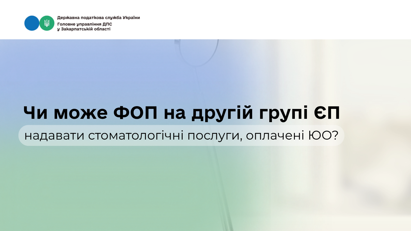 Податківці роз’яснюють, чи має право ФОП перебувати на другій групі платника ЄП, якщо відповідно до договору вона надає стоматологічні послуги військовослужбовцю, вартість яких оплачує ЮО (громадська або неприбуткова організація).