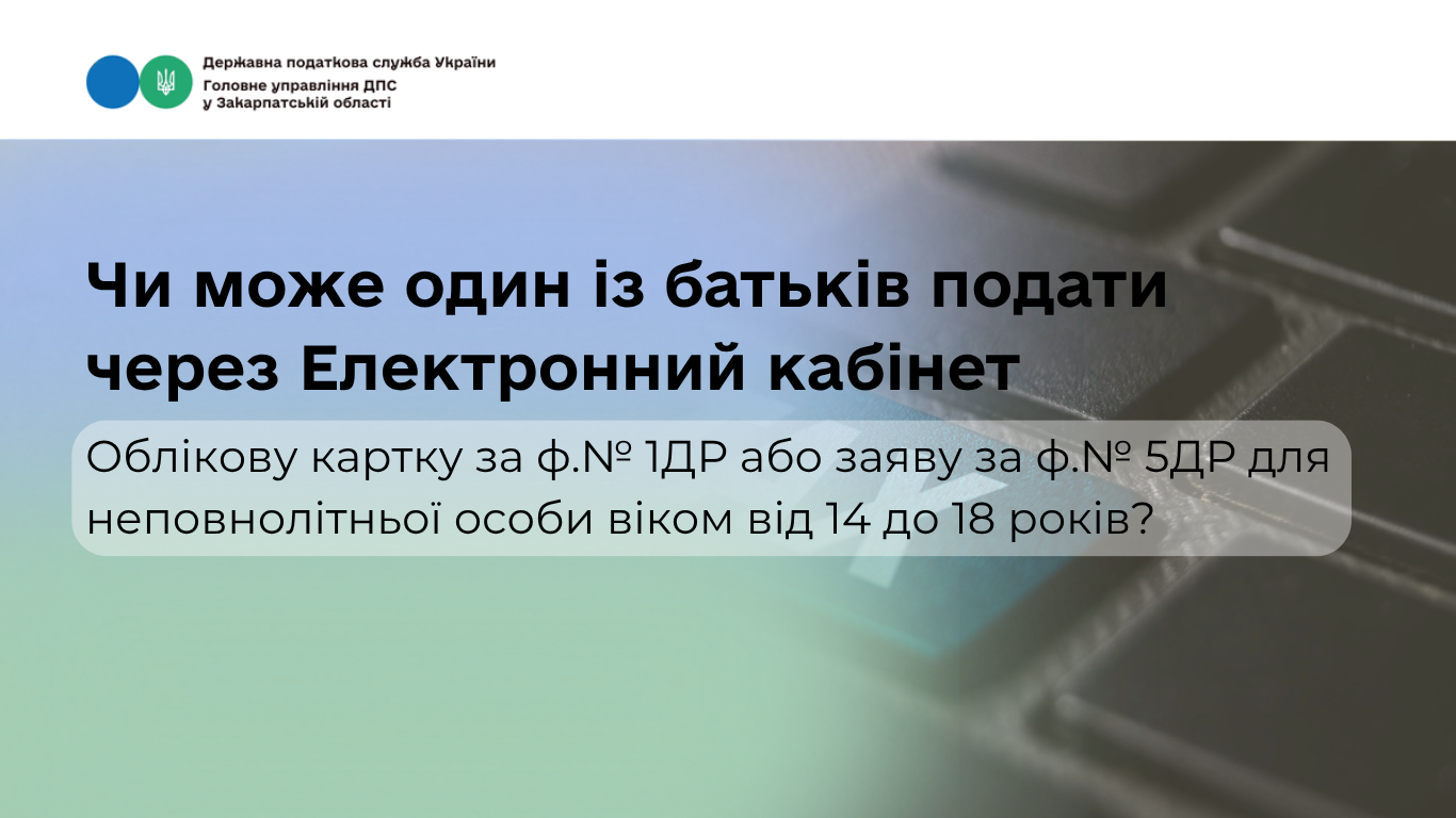 Один із батьків може подати через Електронний кабінет Облікову картку за ф. № 1ДР/Заяву за ф. № 5ДР неповнолітньої особи віком від 14 до 18 років та додати документи, необхідні для реєстрації/внесення змін до Державного реєстру, зокрема документ, що посвідчує особу одного із батьків, та паспорт громадянина України неповнолітньої особи.
