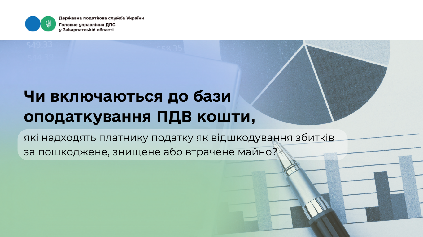Враховуючи викладене, кошти, які надходять платнику податку як відшкодування збитків за пошкоджене, знищене або втрачене майно, не включаються до бази оподаткування ПДВ.