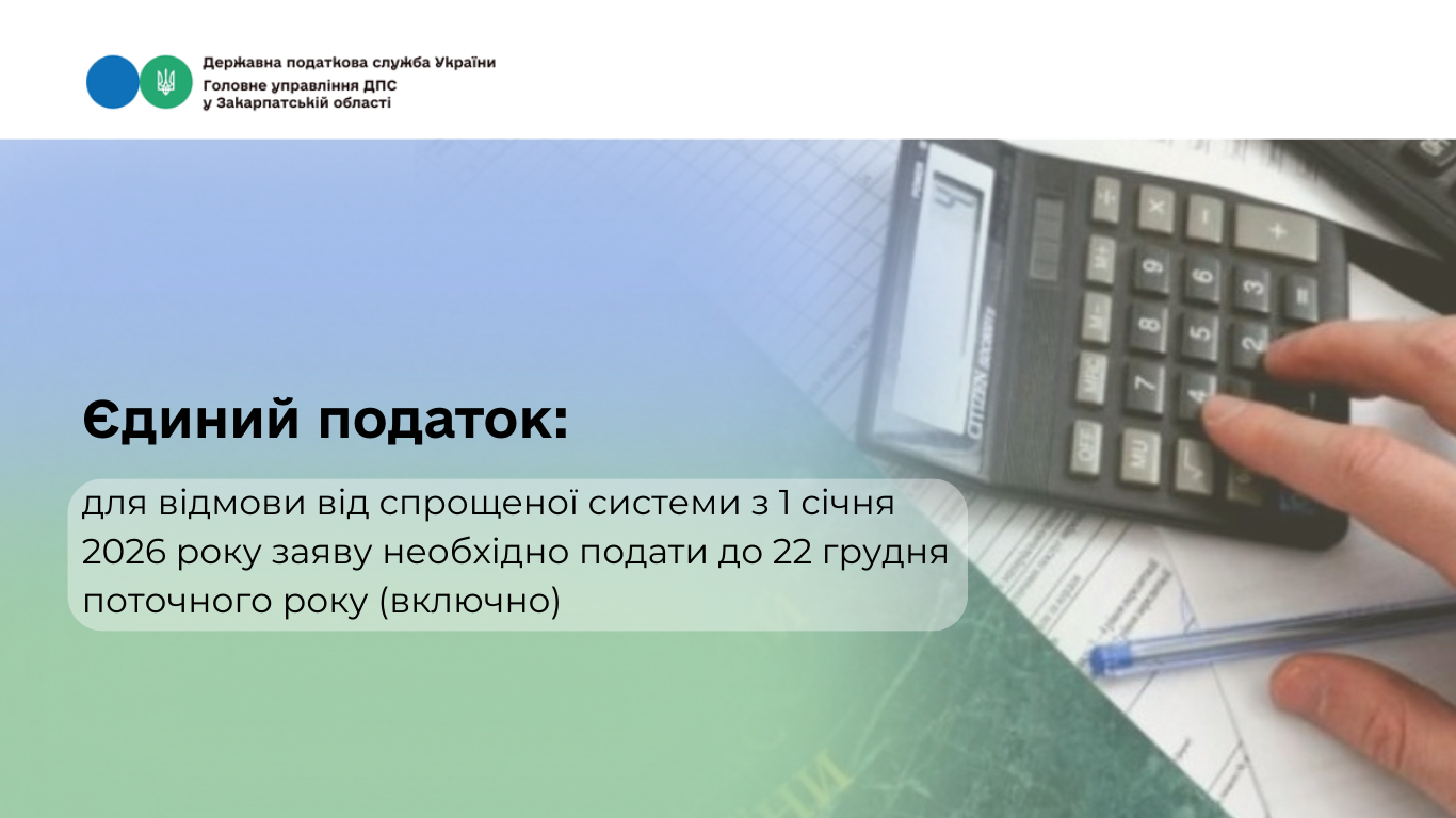 У Головному управлінні ДПС у Закарпатській області нагадують, що для відмови від спрощеної системи оподаткування суб’єкт господарювання має подати до контролюючого органу заяву не пізніше ніж за 10 календарних днів до початку нового календарного кварталу (року). Тобто, подати заяву про відмову з 1 січня 2026 року від спрощеної системи оподаткування платник єдиного податку може подати заяву до 22 грудня 2025 року (включно).