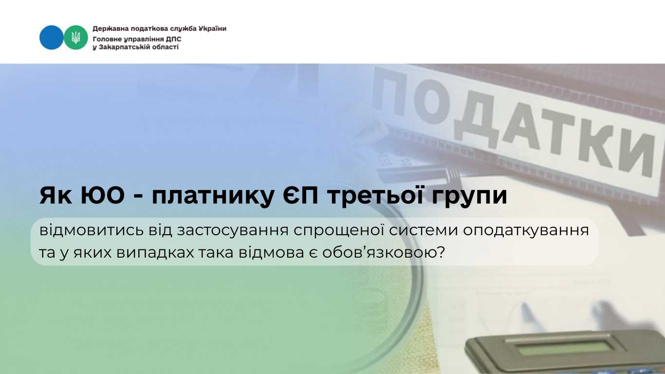 Відповідно до п. 298.2 ст. 298 Податкового кодексу України (далі – ПКУ) відмова від спрощеної системи оподаткування, зокрема, платниками єдиного податку третьої групи здійснюється в порядку, визначеному підпунктами 298.2.1 – 298.2.3 п. 298.2 ст. 298 ПКУ.