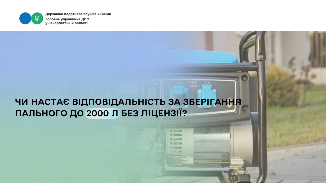 Податківці інформують платників, чи є підставою для застосування відповідальності за зберігання пального без ліцензії, якщо СГ не подано повідомлення про зберігання пального для заправлення електрогенераторних установок в обсязі до 2000 літрів.