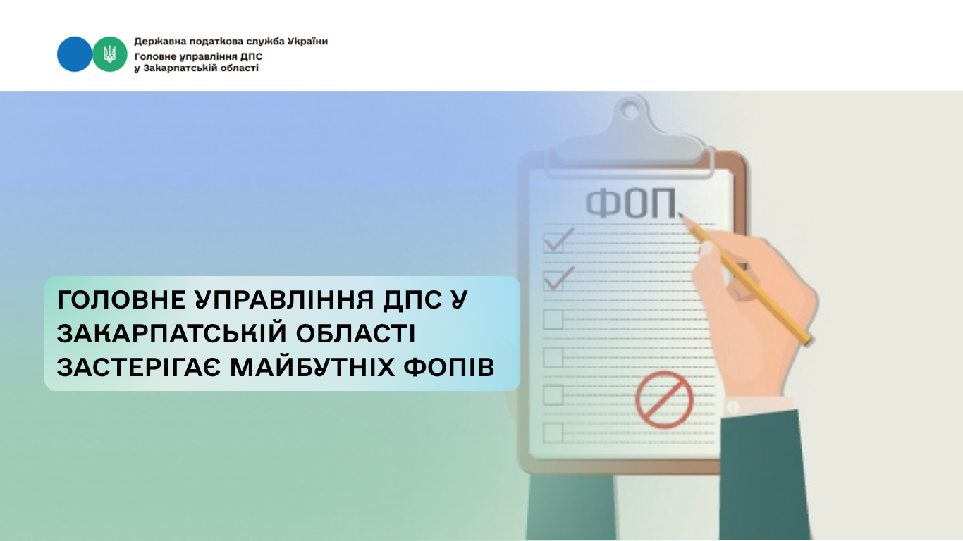 Головне управління ДПС у Закарпатській області повідомляє, що громадяни, які погоджуються на пропозиції окремих суб’єктів господарювання щодо реєстрації фізичної особи – підприємця (ФОП) за винагороду з метою використання такого ФОП у господарській діяльності третіх осіб, наражаються на значні правові та фінансові ризики.