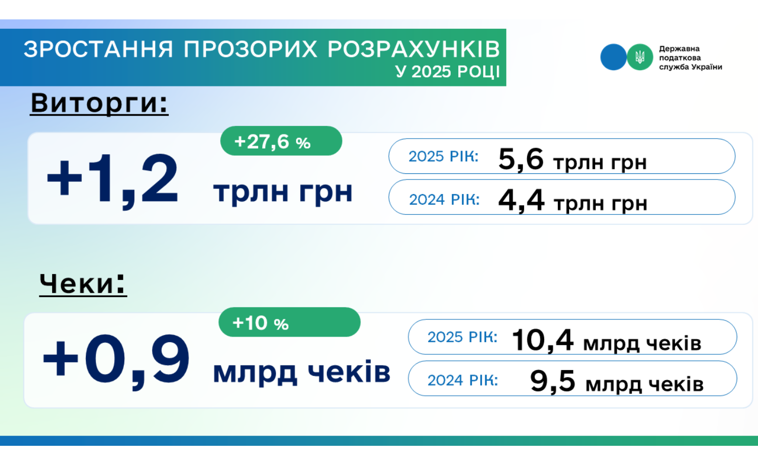 Загалом за рік задекларовані виторги через реєстратори розрахункових операцій зросли до 5,6 трлн грн. Це на понад 1,2 трлн грн або на 27,6 % більше, ніж у 2024 році.
