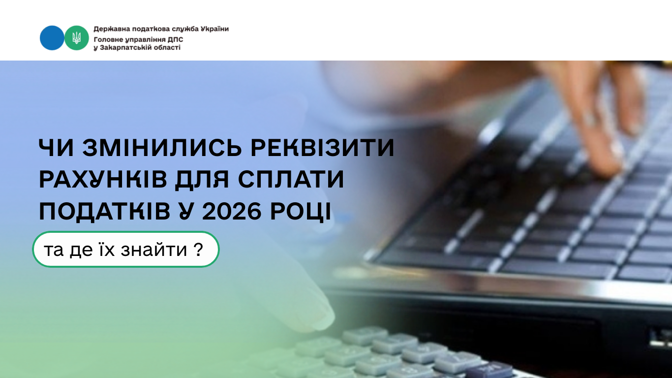Головне управління Державної податкової служби ДПС у Закарпатській області повідомляє ,що реквізити рахунків для сплати податків у 2026 році не змінилися, окрім рахунків за такими кодами класифікації доходів бюджету: