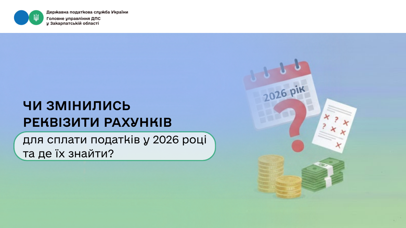 Головне управління ДПС у Закарпатській області повідомляє ,що реквізити рахунків для сплати податків у 2026 році не змінилися, окрім рахунків за такими кодами класифікації доходів бюджету: