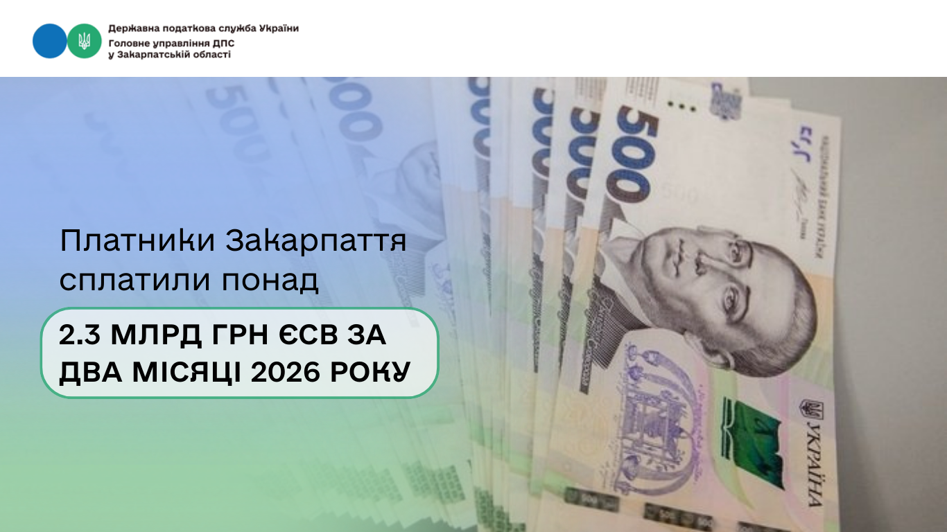 Упродовж січня–лютого 2026 року платники Закарпатської області сплатили понад 2 млрд 349 млн грн єдиного внеску на загальнообов’язкове державне соціальне страхування. Це на 19,2 % або на 378 млн грн більше, ніж за аналогічний період 2025 року.