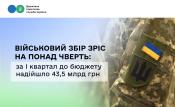 У січні – березні 2026 року надходження військового збору до бюджету склали 43,5 млрд грн. Це на 27,5 % більше, ніж за аналогічний період минулого року. Торік надійшло 34,1 млрд грн військового збору.