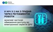 У зв’язку з проведенням обслуговування програмно-технічного комплексу Кваліфікованого надавача електронних довірчих послуг Державної податкової служби України з 23 год 00 хв 02.12.2025 до 01 год 00 хв 03.12.2025 можливі часткові обмеження доступу до його електронних сервісів.