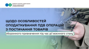 Відповідно до п.п. 4 п. 32 підрозд. 2 розд. XX «Перехідні положення» Податкового кодексу України (далі – ПКУ) тимчасово, на період проведення антитерористичної операції та/або здійснення заходів із забезпечення національної безпеки і оборони, відсічі і стримування збройної агресії Російської Федерації, та/або запровадження воєнного стану відповідно до законодавства, звільняються від оподаткування податком на додану вартість операції з ввезення на митну територію України та постачання на митній території України: