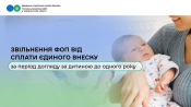 Враховуючи викладене, починаючи з 01.01.2026 фізична особа – підприємець, яка здійснює догляд за дитиною до досягнення нею однорічного віку та відповідно до закону отримує допомогу для догляду за дитиною до досягнення нею однорічного віку, звільняється від сплати єдиного внеску за себе за місяці звітного періоду, за які роботодавцем сплачується за таку особу єдиний внесок у розмірі не меншому від мінімального страхового внеску.